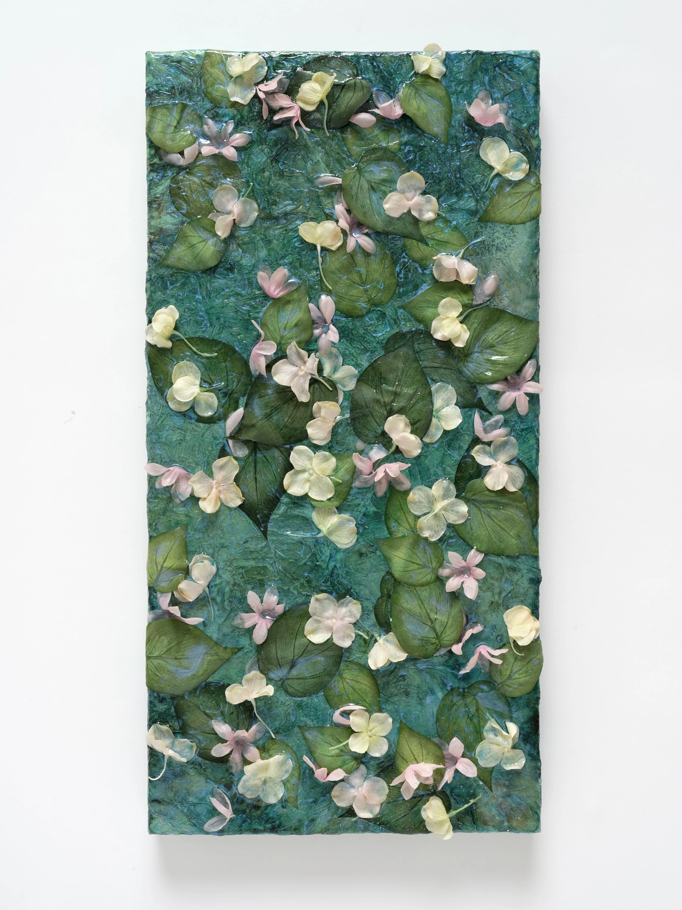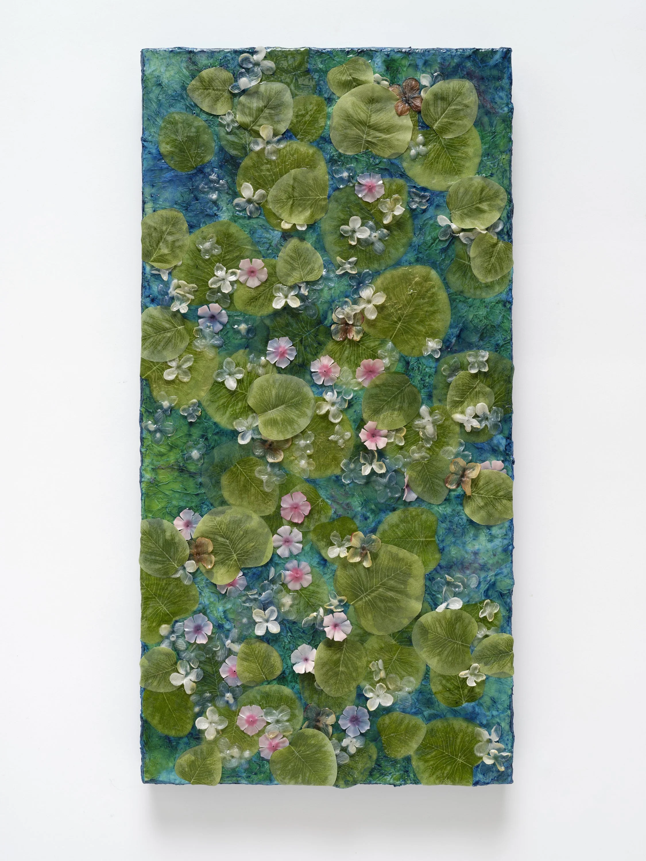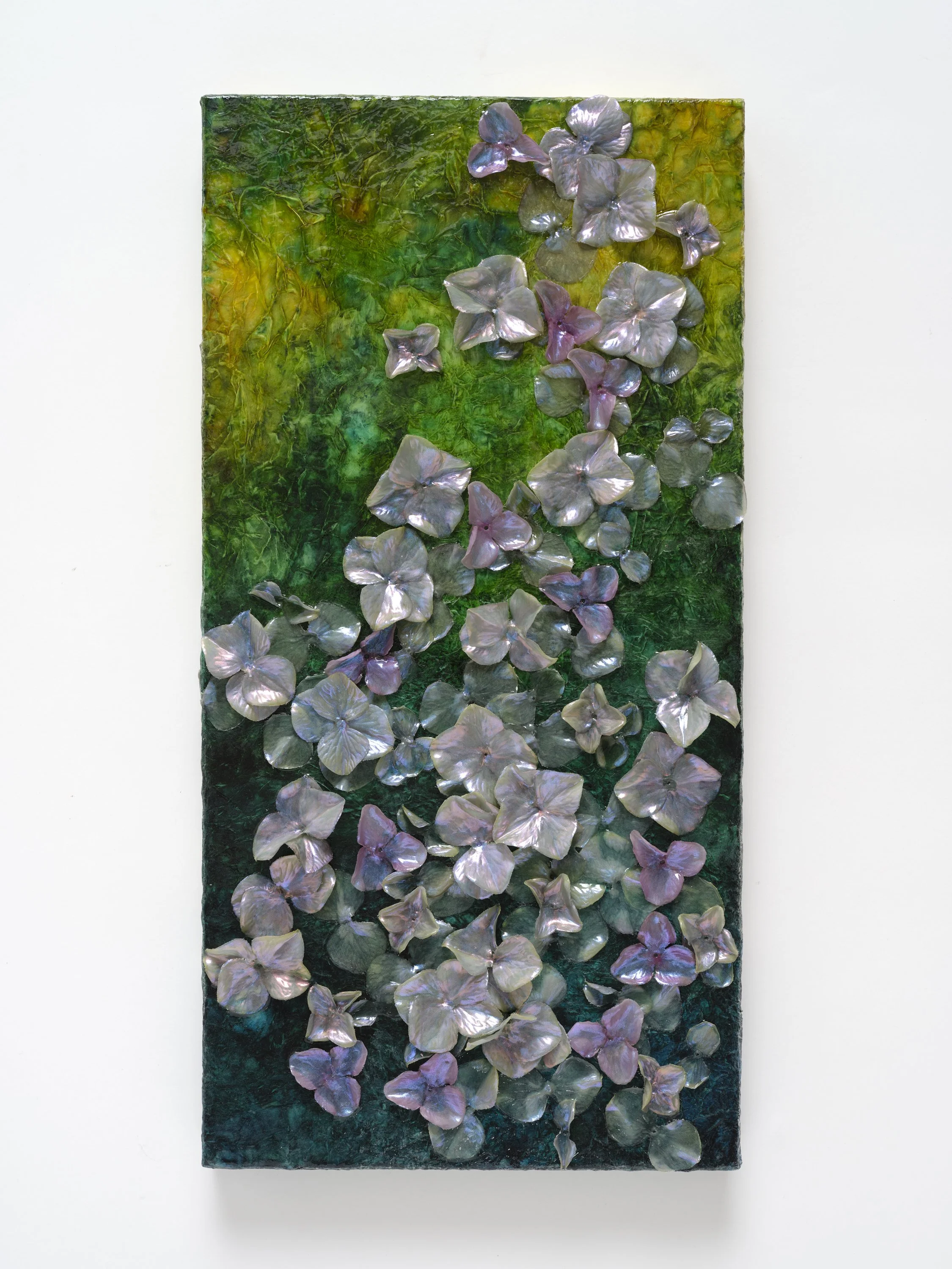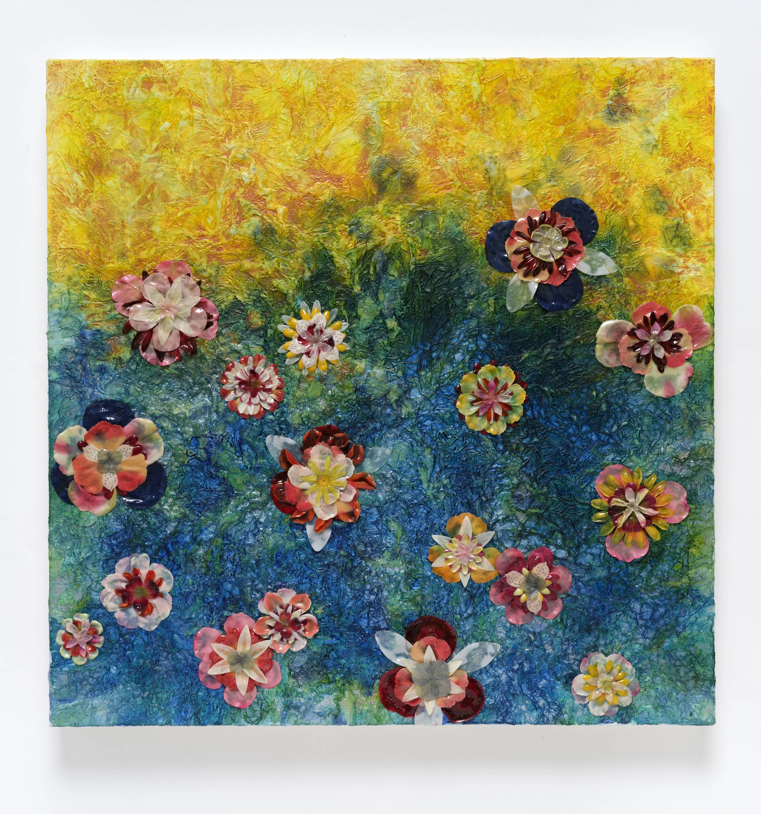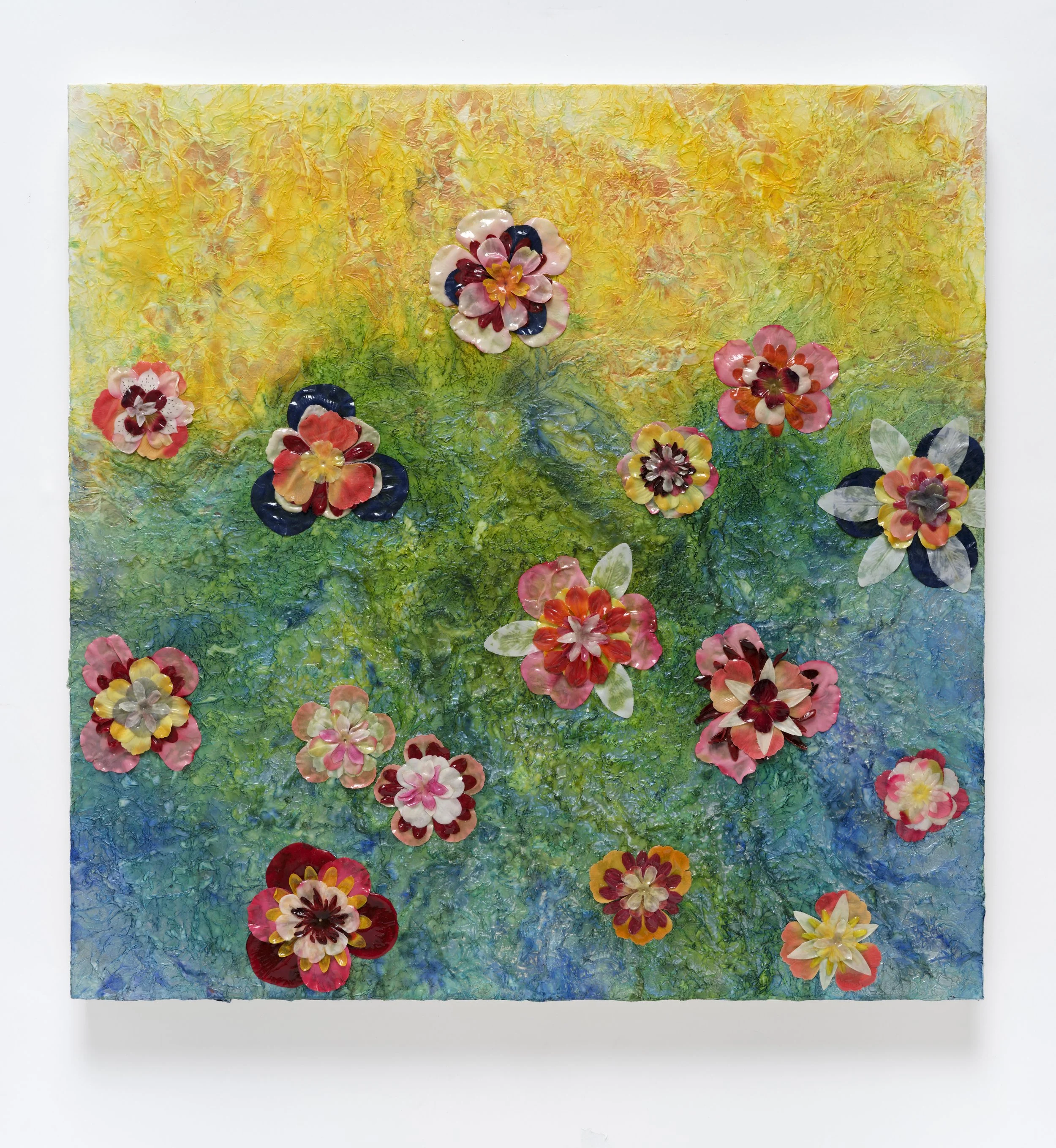 Canvas, Gesso, Tissue Paper, Inks, Fluid Acrylic Paint, Watercolor, Iridescent Powder, Gel Medium, Varnish, Modeling Paste, Polyethylene Terephthalate, Viscose Fiber